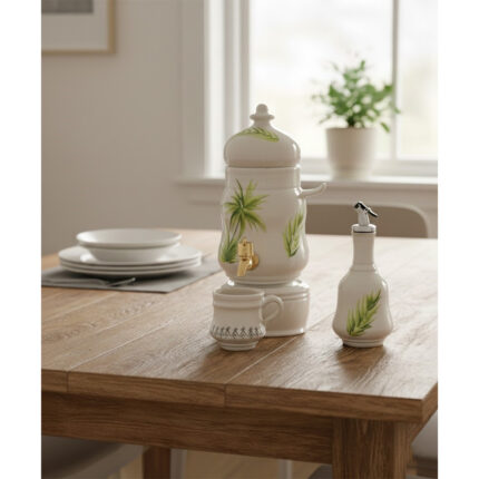 Pack 5 Pièces Baril à huile Distributeur d’huile d’olive + 1 Pack de 4 Pièces gratuit Distributeur d’eau fraiche en fine céramique fait main motif palmier vert