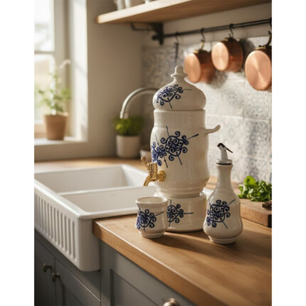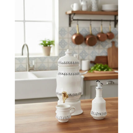 Pack 5 Pièces Baril à huile Distributeur d’huile d’olive + 1 Pack de 4 Pièces gratuit Distributeur d’eau fraiche en fine céramique fait main motif Fer forgé