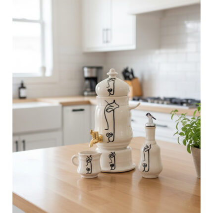 Pack 5 Pièces Baril à huile Distributeur d’huile d’olive + 1 Pack de 4 Pièces gratuit Distributeur d’eau fraiche en fine céramique fait main motif Face Art