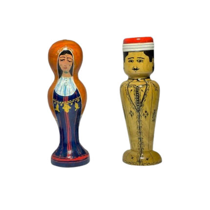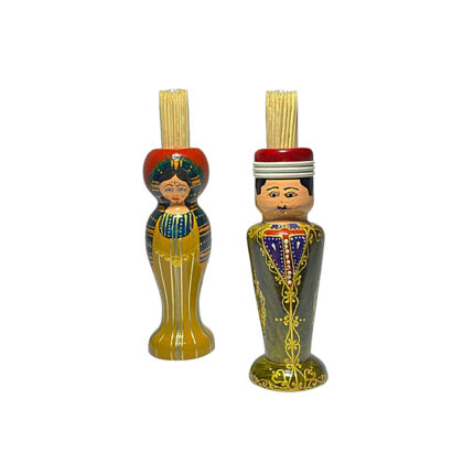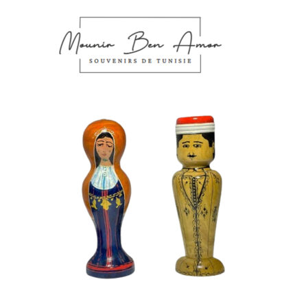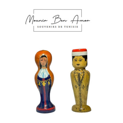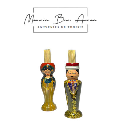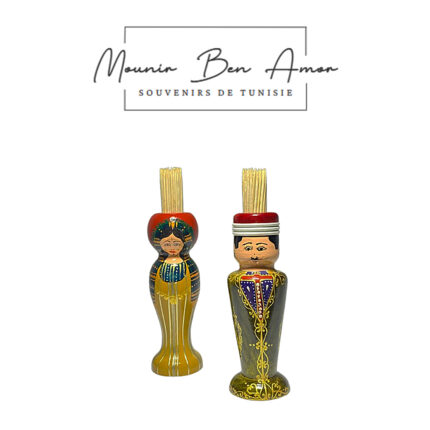 Set de 2 Porte cure dent de décorative peint à la main sur bois d’olivier Sélection de 2 figurines de couple tunisiens en habit traditionnel Souvenir De Tunisie