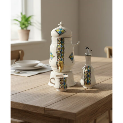 Pack 5 Pièces Baril à huile Distributeur d’huile d’olive + 1 Pack de 4 Pièces gratuit Distributeur d’eau fraiche en fine céramique fait main motif Margoum