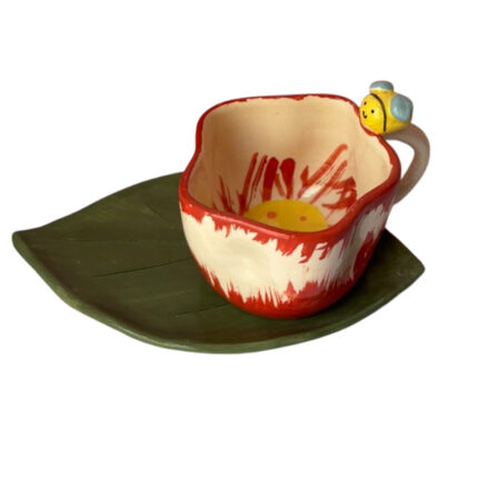 Tasse à café avec sous tasse esprit vintage motif : Fleur et nahoula, en céramique artisanale fait main