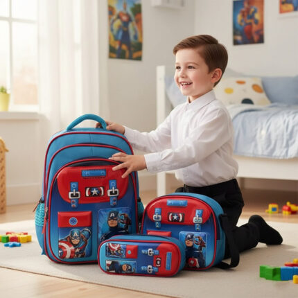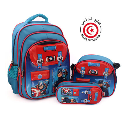 Ensemble scolaire MM haut de gamme 3 pièces design Captain America : 1 Cartable spacieux avec bretelles rembourrées et dos ergonomique 1 Panier isotherme idéal pour les goûters ou déjeuners 1 Trousse assortie pour stylos et accessoires