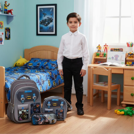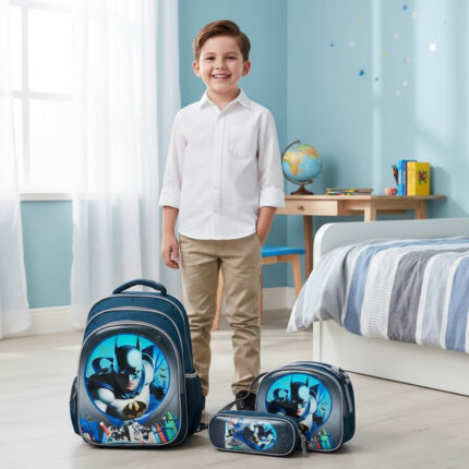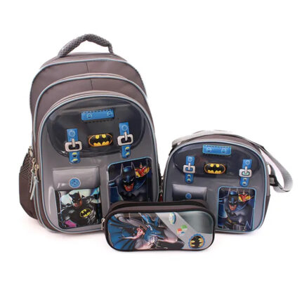 Ensemble scolaire MM haut de gamme 3 pièces design Kimo Batman 1 : 1 Cartable spacieux avec bretelles rembourrées et dos ergonomique 1 Panier isotherme idéal pour les goûters ou déjeuners 1 Trousse assortie pour stylos et accessoires