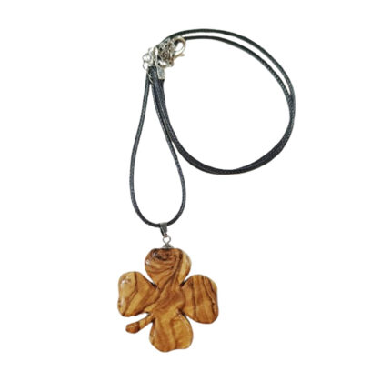 Collier orné d’un pendentif en bois noble sculpté en forme de fleur de trèfle. Inspiré de la nature