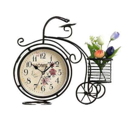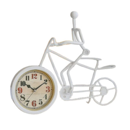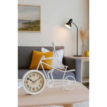 Horloge à poser décorative haut de gamme en blanc Vieillie design Vélo Tricycle Minimaliste avec Panier de style Retro Art Mouvement à quartz silencieux