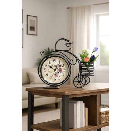 Horloge à poser décorative haut de gamme en noir satiné design Vélo Tricycle Minimaliste avec Panier de style Retro Art Mouvement à quartz silencieux