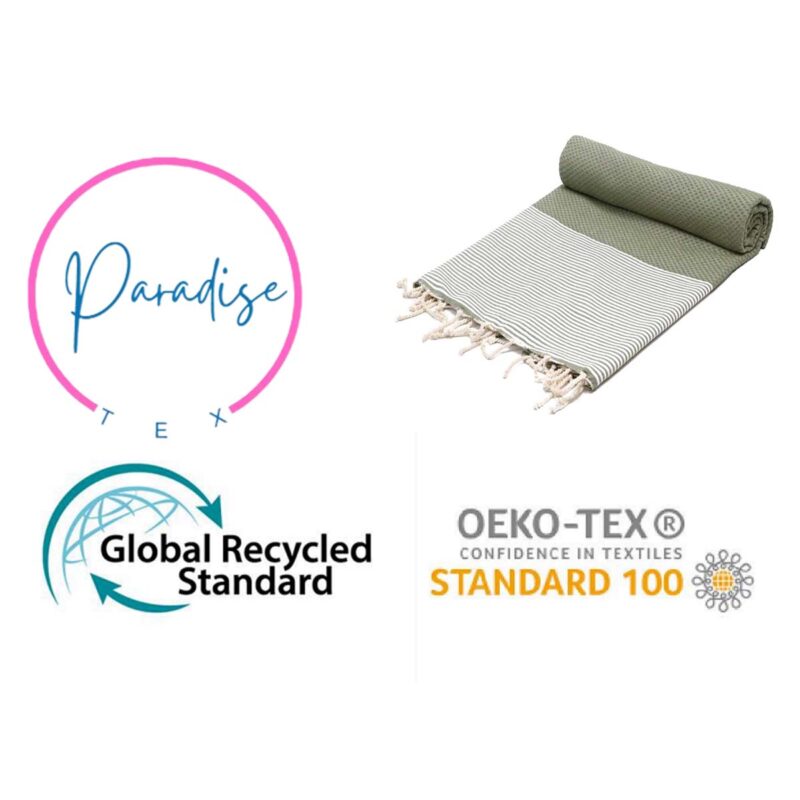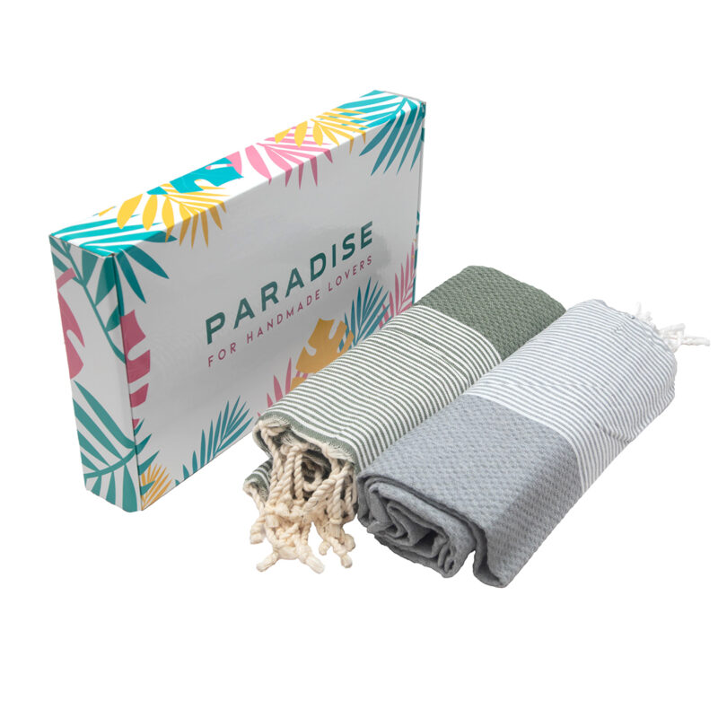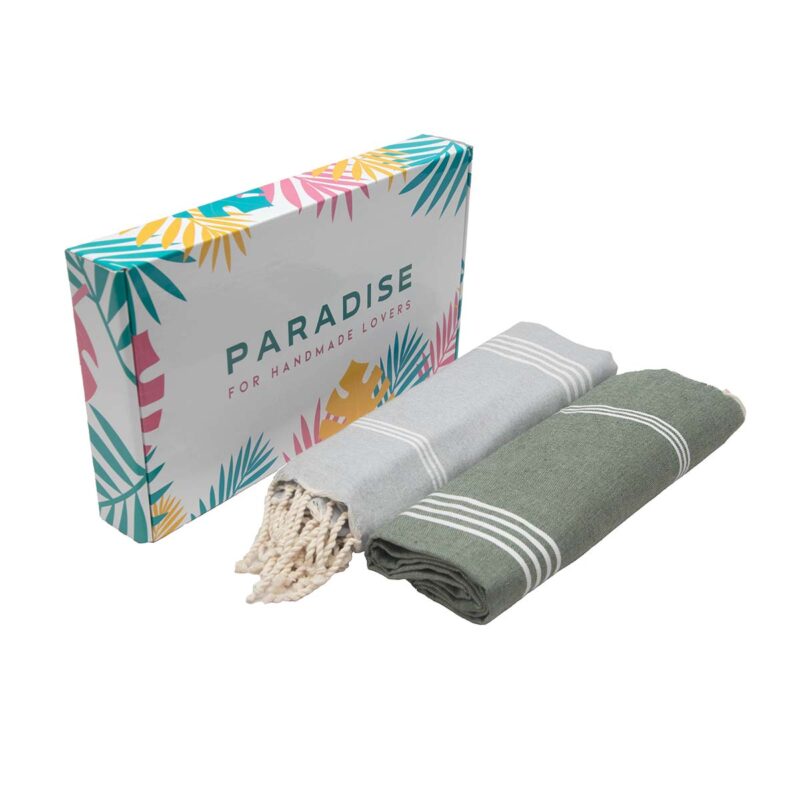 Coffret de 2 Serviette traditionnel polyvalence haut de gamme en coton – Fouta nid d’abeille XL En Gris et Vert kaki rayée blanc Nid d’abeille XL