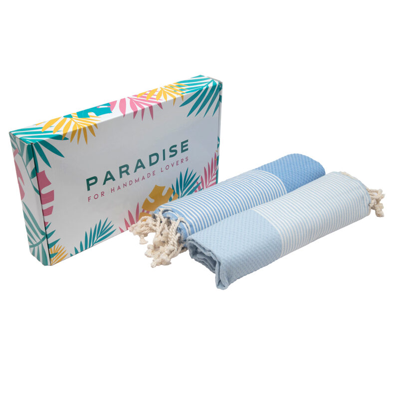 Coffret de 2 Serviettes traditionnel polyvalence haut de gamme en coton – Fouta nid d’abeille XL En Bleu ciel foncé et Bleu ciel rayée blanc Nid d’abeille XL