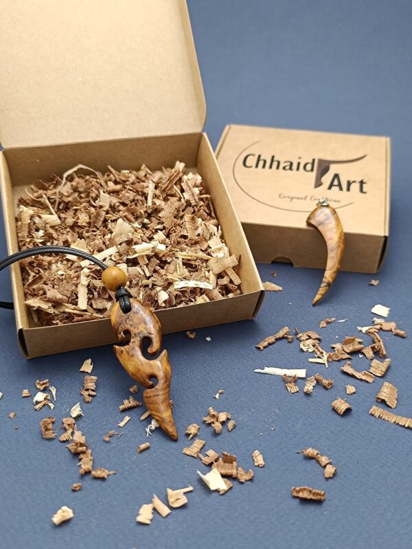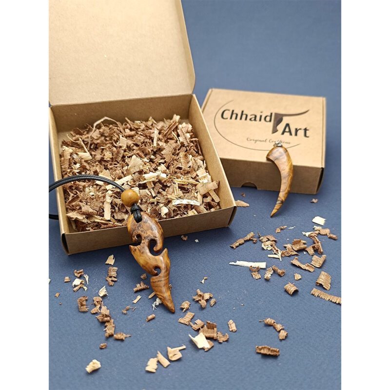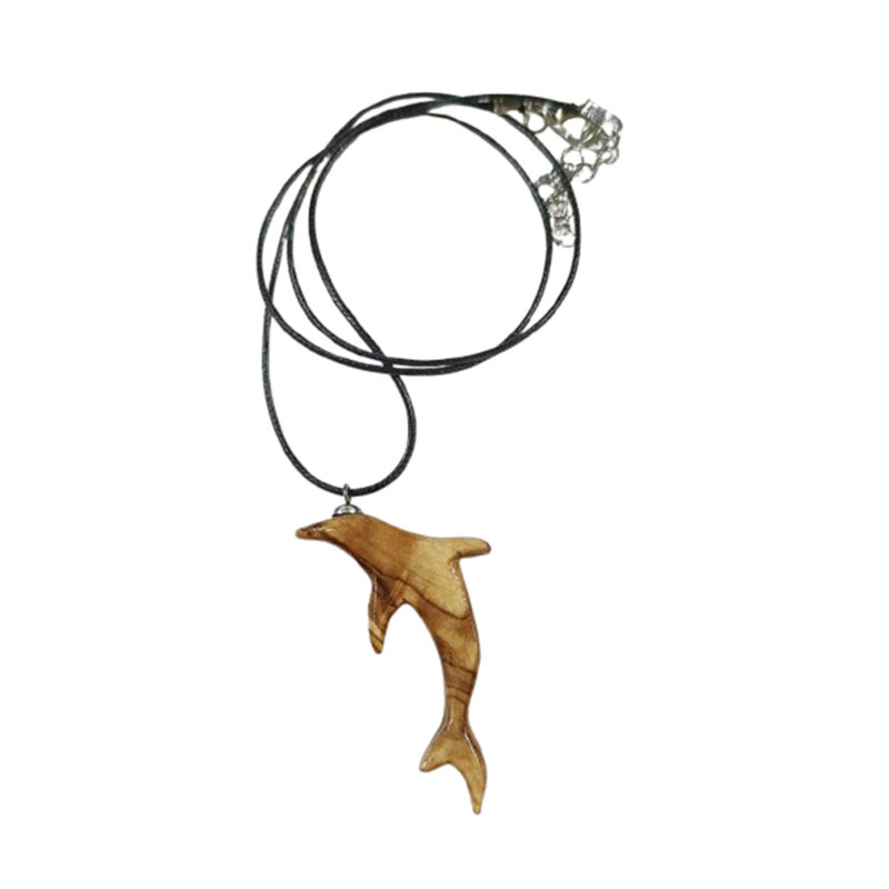 Collier orné d’un pendentif en bois noble sculpté en forme de dauphin. Inspiré de la nature