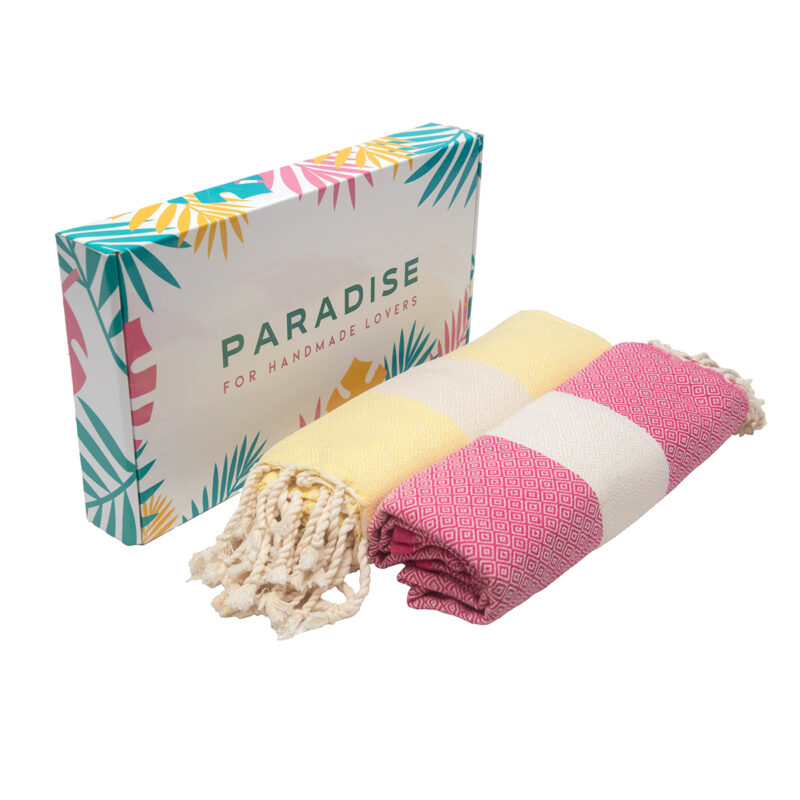 Coffret de 2 Serviette traditionnel polyvalence haut de gamme en coton – Fouta Diamond XL En Jaune et rose fuchsia rayée blanc Diamond XL