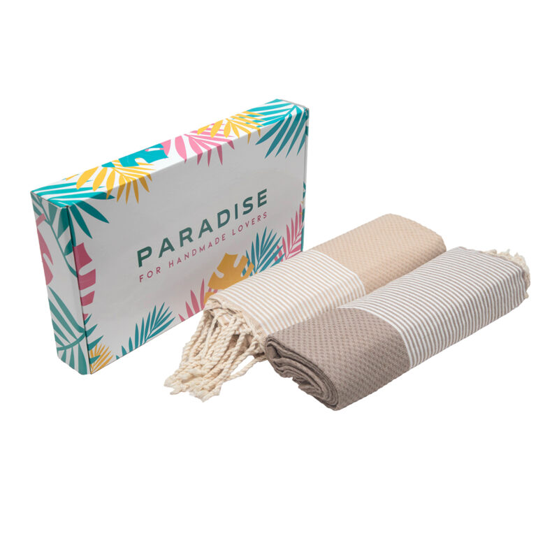 Coffret de 2 Serviette traditionnel polyvalence haut de gamme en coton – Fouta nid d’abeille XL En Beige et taupe rayée blanc Nid d’abeille XL