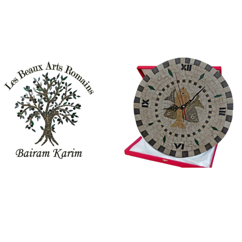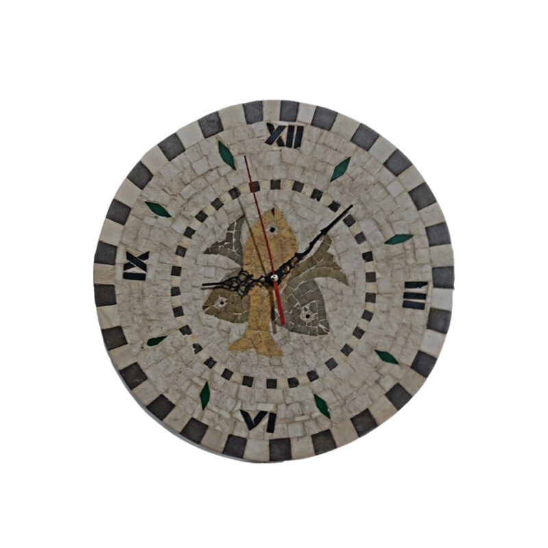Horloge murale ronde en mosaïque romaine fait à la main haut de gamme motif Poissons 1 de la collection Art Murale