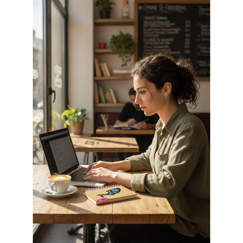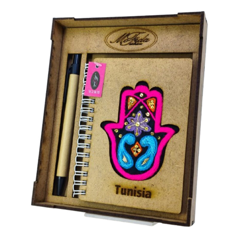 Coffret cadeau haut de gamme 2 pièces * Carnet professionnel, bloc-notes couverture en bois texturé motif khamsa brodée main et un stylo assorti