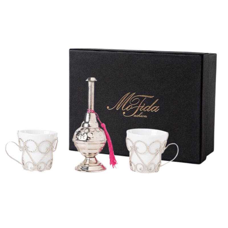 Coffret cadeau haut de gamme duo plaisir 3 pièces * Service à café design arabesque en fine porcelaine et du cuivre martelé fait à la main