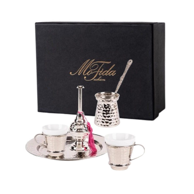 Coffret cadeau haut de gamme duo plaisir 5 pièces * Service à café design arabesque en fine porcelaine et du cuivre martelé fait à la main