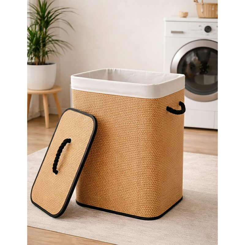 Grand panier à linge tressé à la main en bambou naturel avec couvercle et deux poignées, tissus intérieur amovible en lin, boîte de tri, boîte de rangement