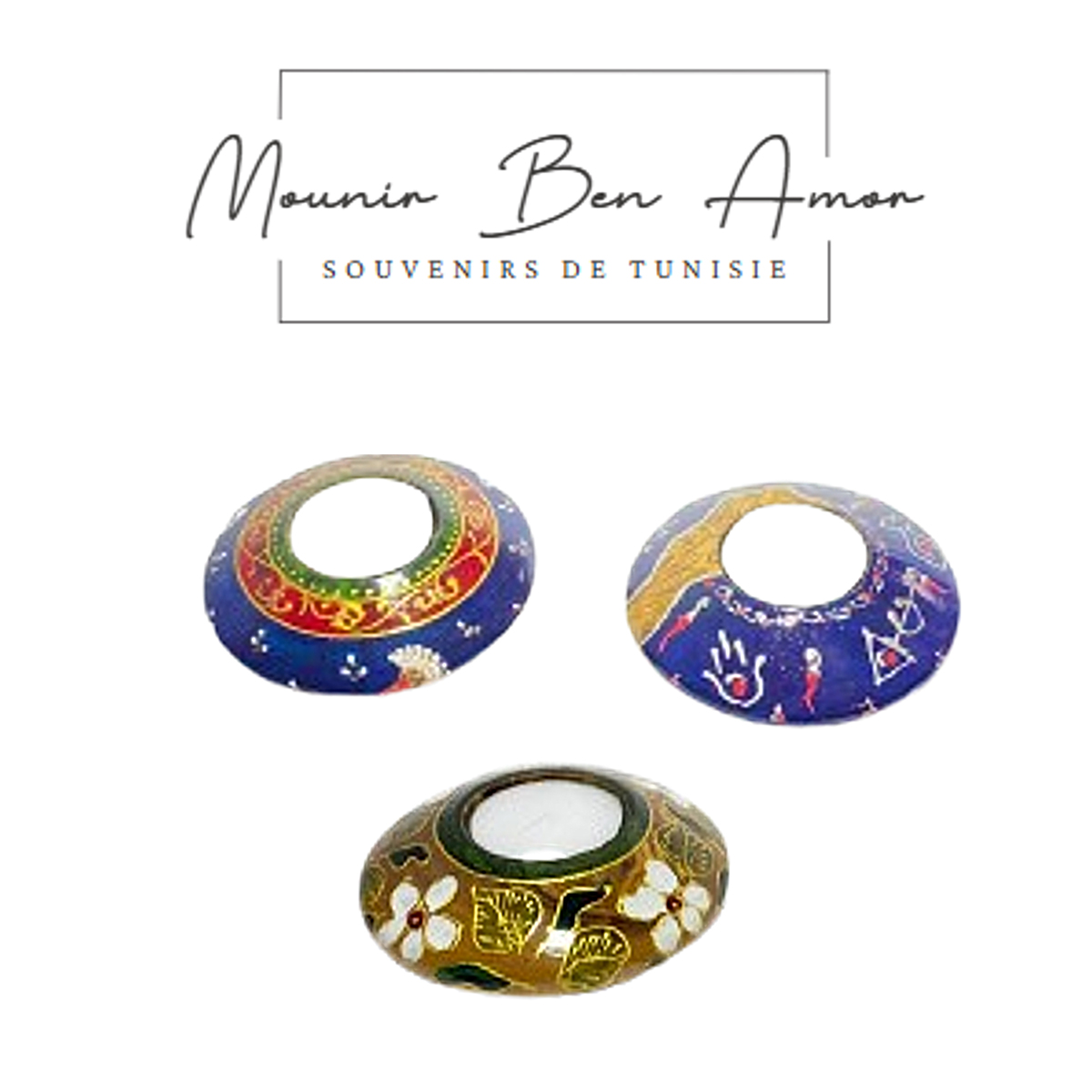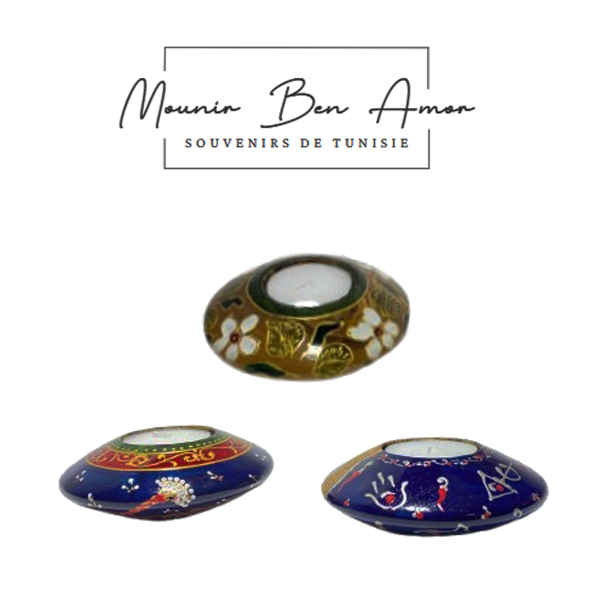Découvrez les pièces uniques issues de notre collection Souvenirs De Tunisie. Ces pièces prestigieuses sont des œuvres réalisées dans notre atelier. Bougeoir haute gamme en bois d’olivier peint à la main design soucoupe motif Jasmins. Un complément unique, idéal pour tous les styles de décoration, parfait pour ajouter un cachet d’originalité à votre décoration maison