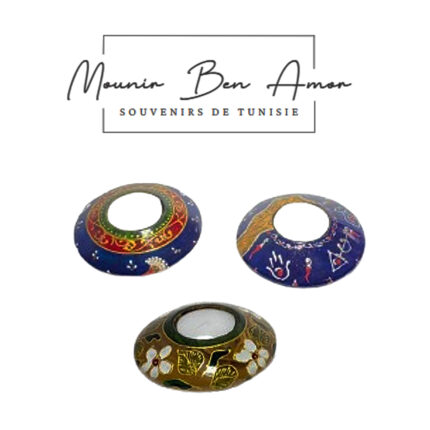 Bougeoir haute gamme en bois d’olivier peint à la main design soucoupe motif Tradition de la collection Souvenir De Tunisie