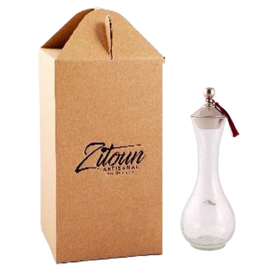 Découvrez et cette nouvelle Carafe Rafraîchissante longue avec réserve à glaçons design arabesque en verre soufflé bouche ciselée à la main, avec une paraison transparente ample et majestueuse et une finesse du buvant incomparable, qui assume définitivement ses contrastes avec cet inventif couvercle en cuivre martelé