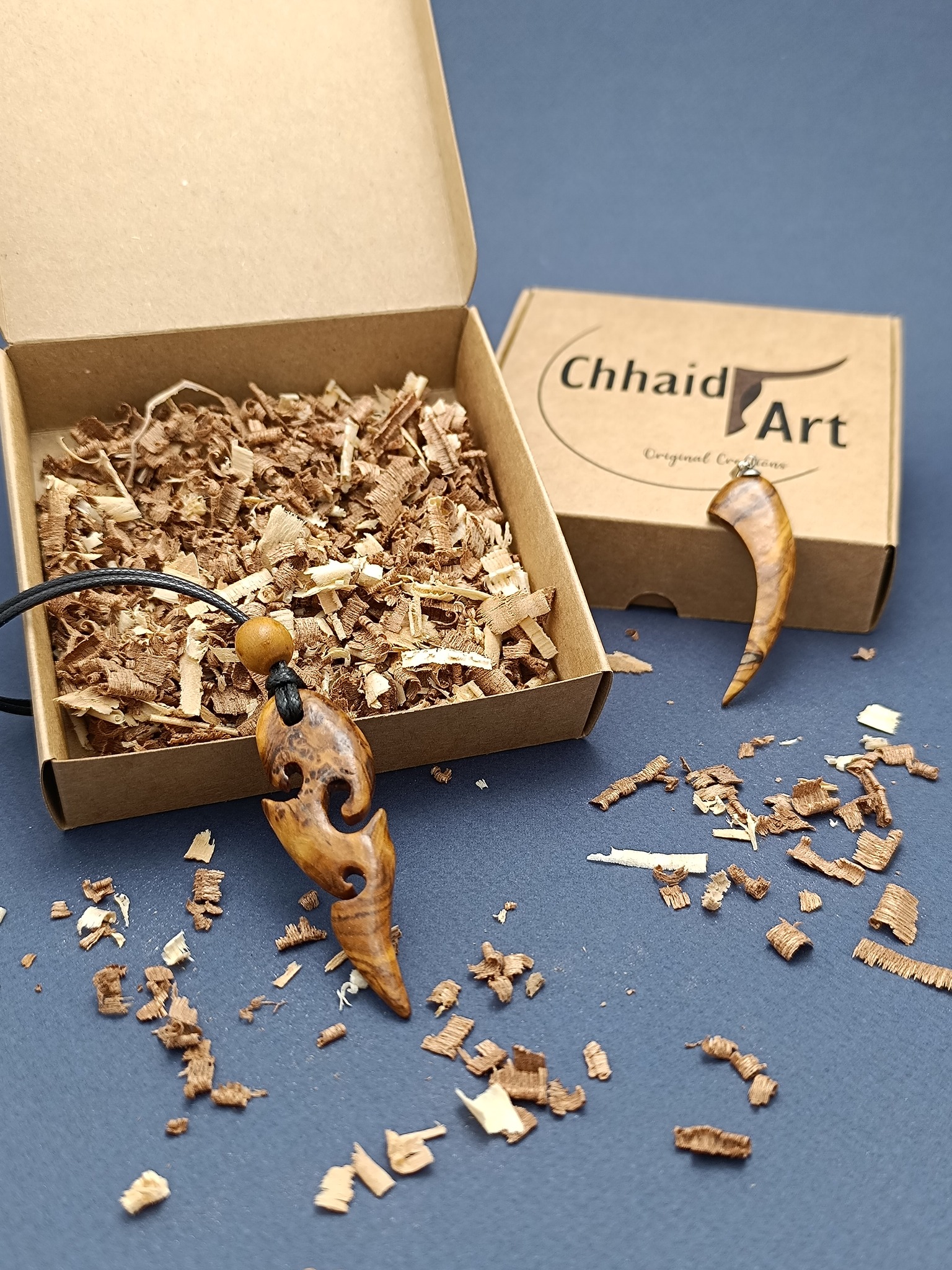 Collier orné d’un pendentif en bois noble sculpté en forme d’ amulette porte bonheur . Inspiré de la nature