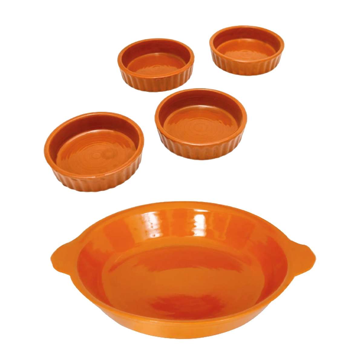 Ensemble de 5 ustensiles de cuisson en Céramique émaillée « pâte à feu » 1 Moule à tarte tradition rond évasé et 4 moules à tartelettes tradition ronde