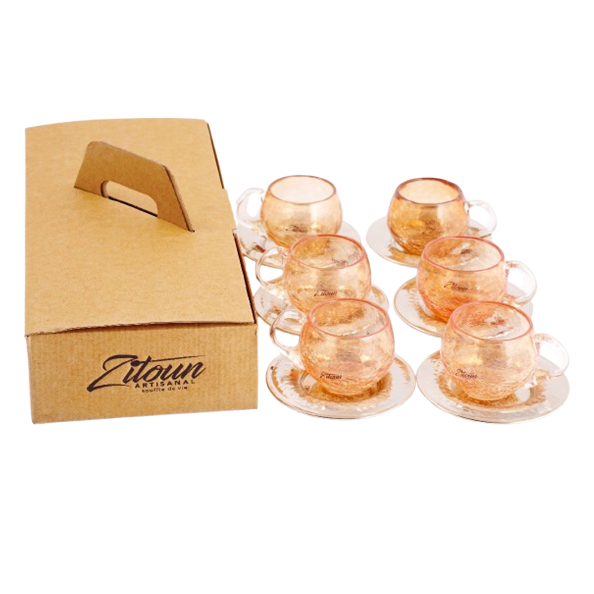 Ensemble de 6 verres à café MM en verre soufflé craquelé avec sous tasse en cuivre martelé artisanal د.ت156.000
