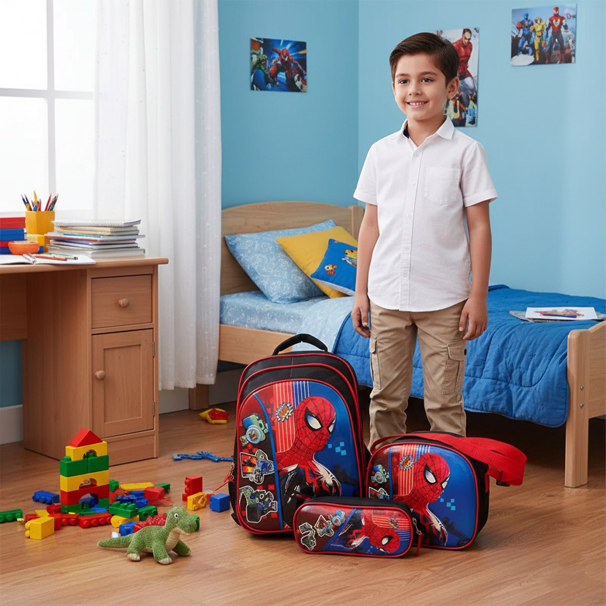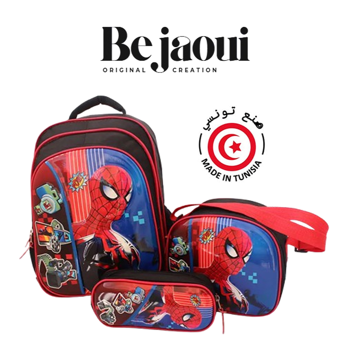 Ensemble scolaire MM haut de gamme 3 pièces design Kimo Batman 2 : 1 Cartable spacieux avec bretelles rembourrées et dos ergonomique 1 Panier isotherme idéal pour les goûters ou déjeuners 1 Trousse assortie pour stylos et accessoires د.ت85.000