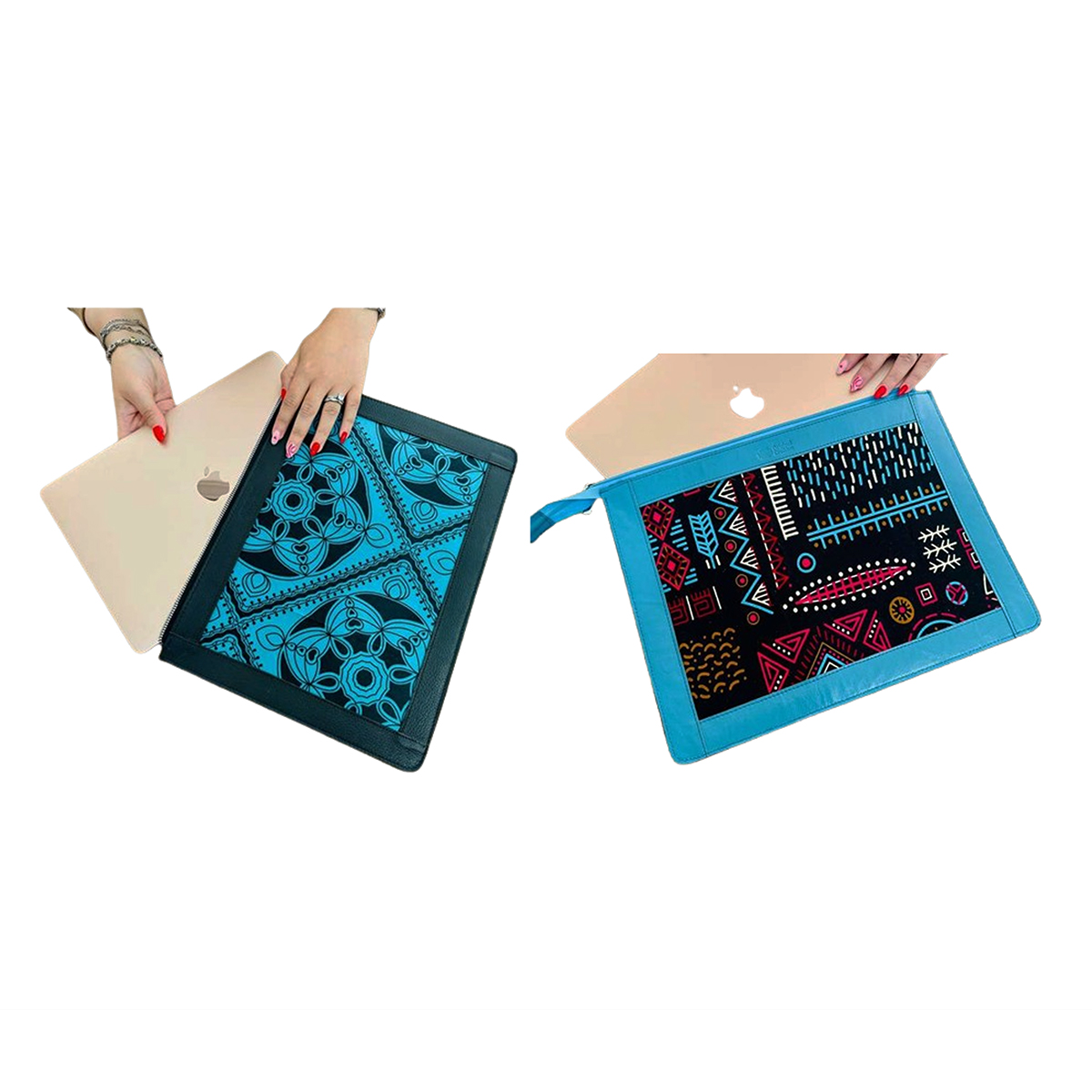 Housse ordinateur portable 13 pouces originale en tissu coton wax habillage en cuir véritable N° 22 د.ت98.000