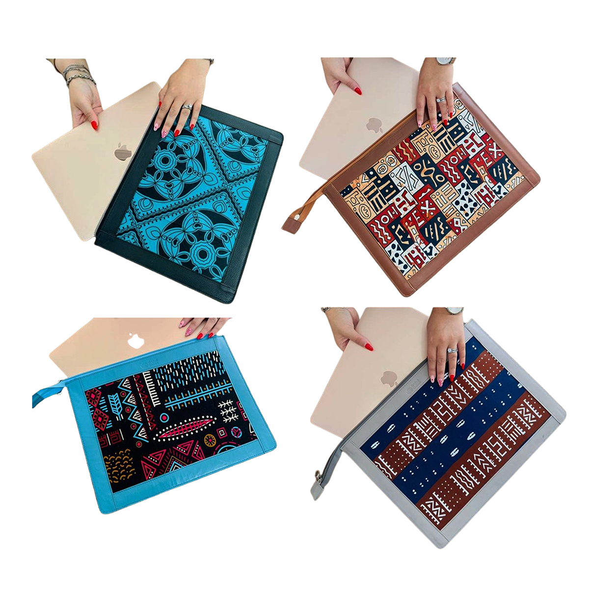 Housse ordinateur portable 13 pouces originale en tissu coton wax habillage en cuir véritable N° 20 د.ت98.000