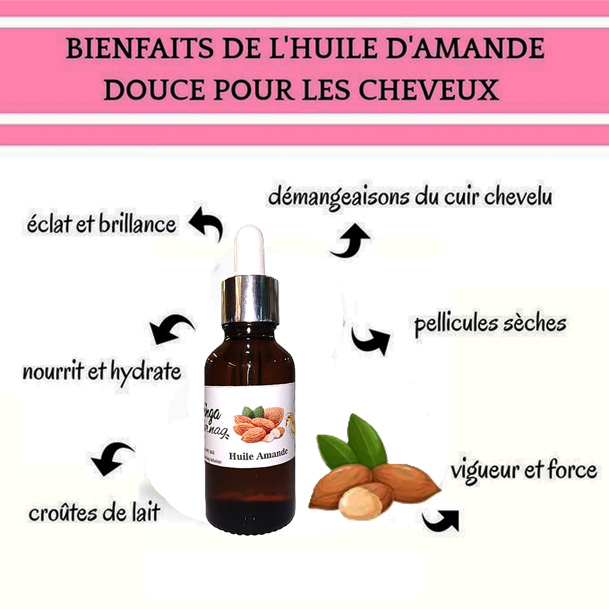 Favorise la pousse, prévient la chute : Grâce à ses nombreux nutriments et antioxydants, l’huile d’amande douce stimule le bulbe capillaire et favorise la croissance de cheveux en bonne santé. Elle prévient aussi la chute et la casse. Lorsque vous l’appliquez, nous vous conseillons d’effectuer des doux massages circulaires sur votre cuir chevelu pour bien la faire pénétrer et activer la microcirculation sanguine du scalp propice à la pousse de vos cheveux.