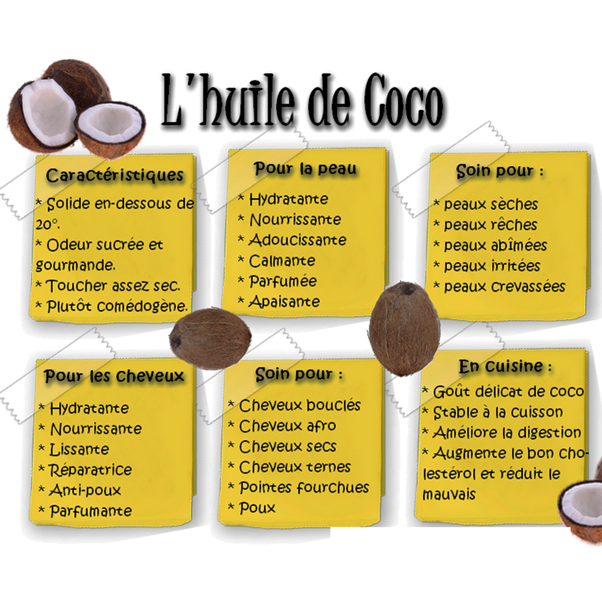 L’huile de coco répare les cheveux secs. Utilisée en masque hydratant, elle leur redonne éclat et souplesse. Elle vous permet également de remédier aux cheveux fourchus.