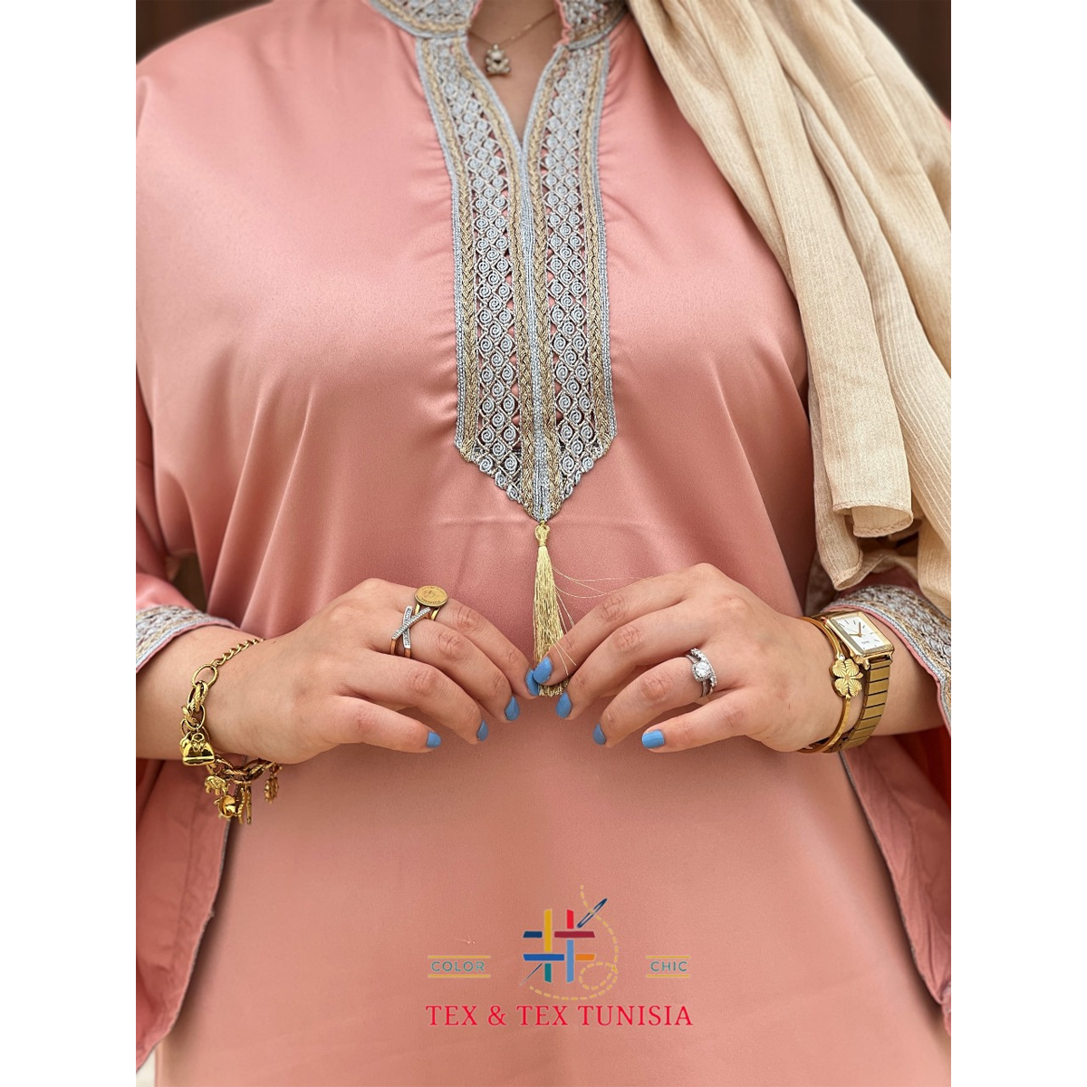 Découvrez les pièces uniques issues de notre collection Jebba fashion printemps-été 2025. Ces pièces prestigieuses sont des œuvres réalisées dans notre atelier. Jebba « Joury » en Satin Osaka, cette matière permet une coupe structurée tout en gardant l’aspect respirant et agréable d’une pièce légère. En rose poudré décorée de détails brodés sur la poche poitrine, la JEBBA est un hommage à l’artisanat tunisien.