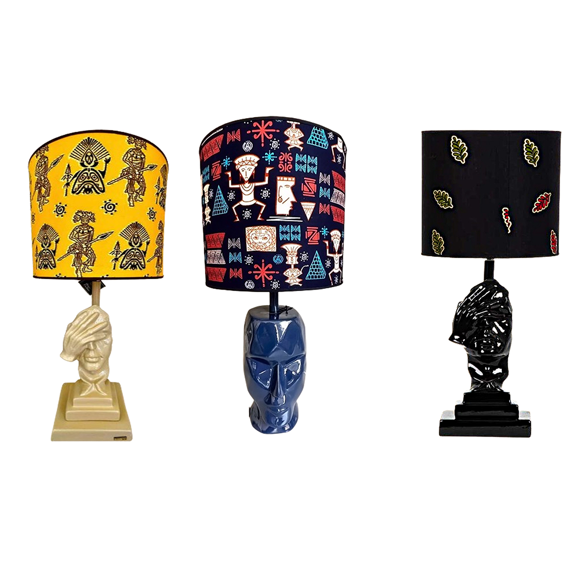 Entièrement fabriqué à la main, l’abat-jour a été confectionné en tissus africain wax, structure en acier traitée, Le pied a été confectionné en céramique avec un grand souci du détail et avec soin
