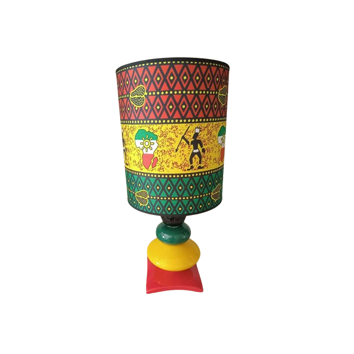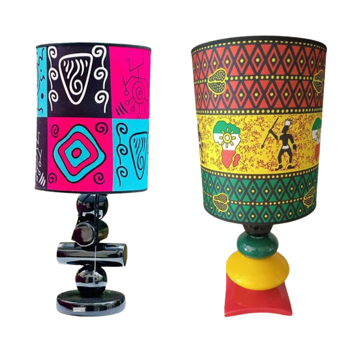 Entièrement fabriqué à la main, l’abat-jour a été confectionné en tissus africain wax, structure en acier traitée, Le pied a été confectionné en céramique avec un grand souci du détail et avec soin