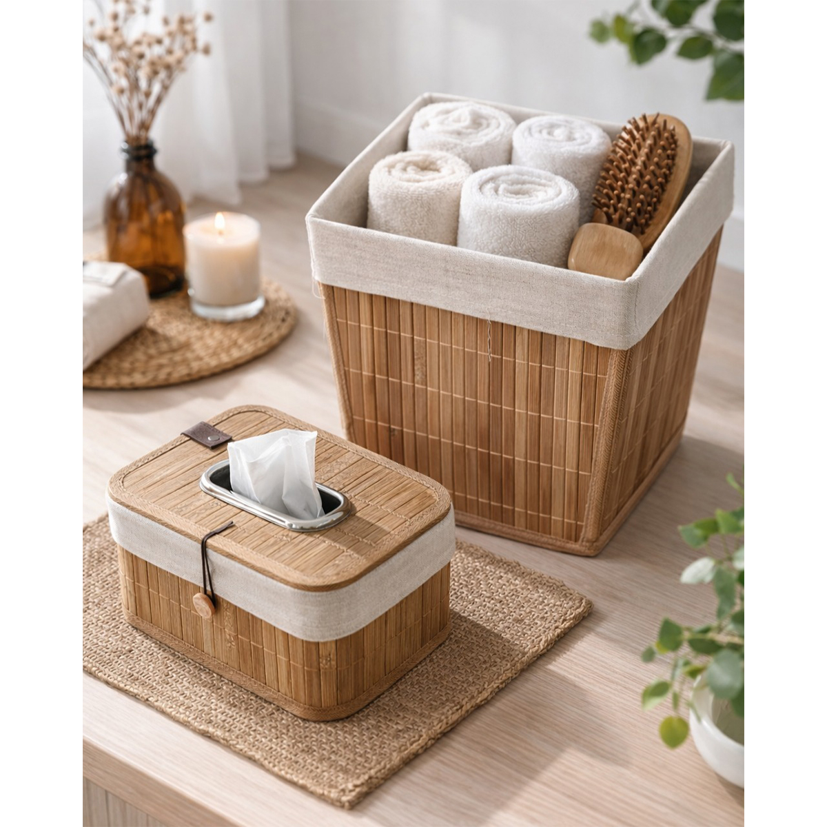 Pack de 2 Paniers de rangement en bambou 1 Paniers de rangement et 1 boîte distributeur à papier, style vintage