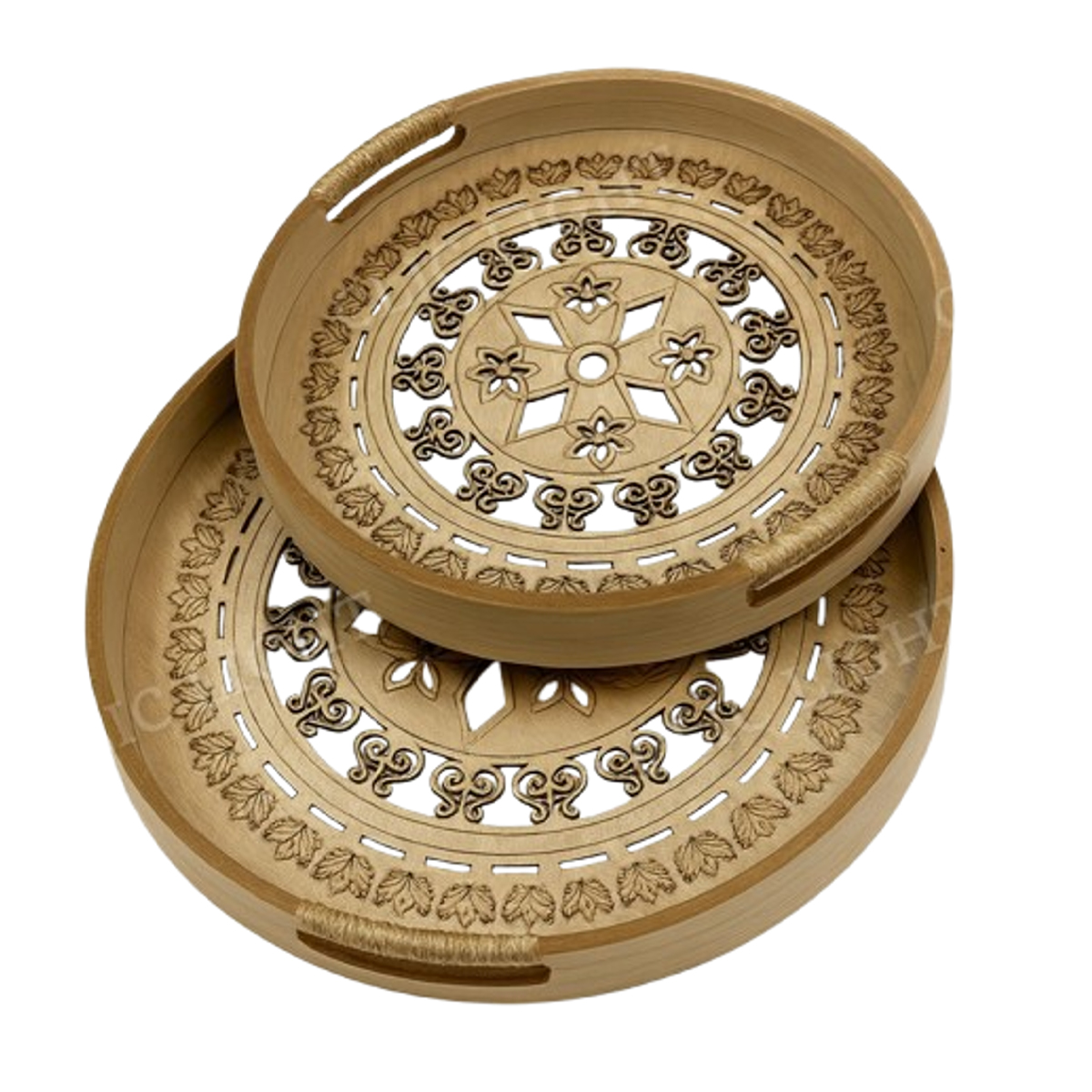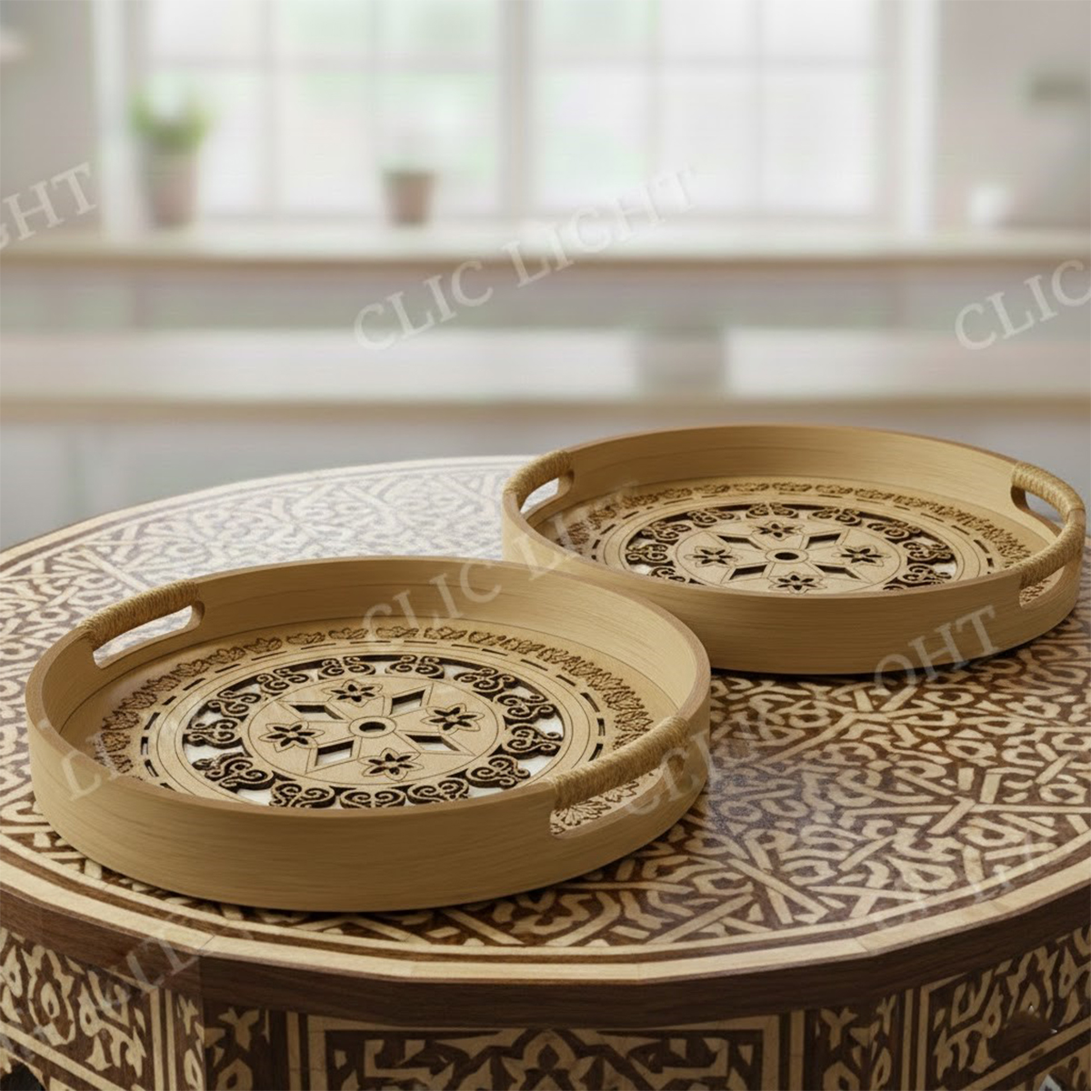 Pack de 2 Plateau de service rondes haut gamme en bambou sculpté fond vitré motif arabesque avec poignées découpées en corde tressée GM & MM