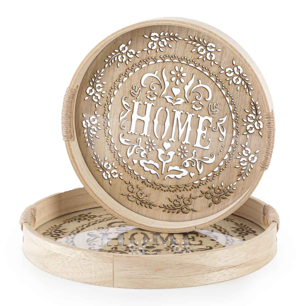 Pack de 2 Plateau de service rondes haut gamme en bambou sculpté fond vitré motif arabesque avec poignées découpées en corde tressée GM & MM