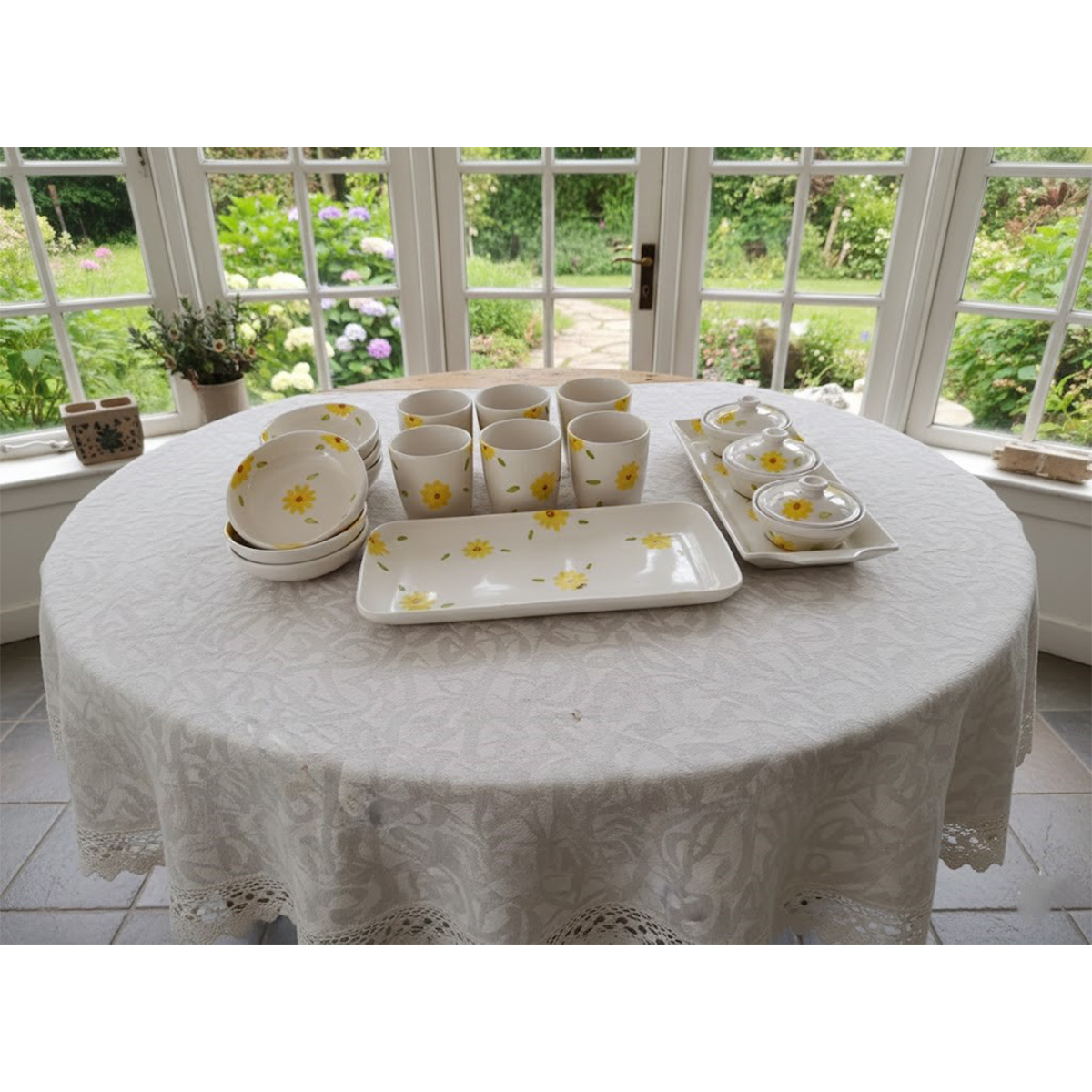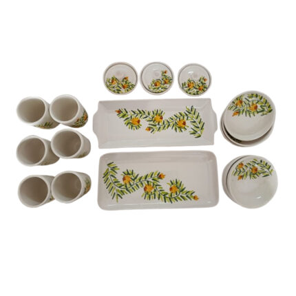 L’Éclat Ensoleillé des Fleurs des champs à Votre Table ! Découvrez notre Service à dessert de 20 pièces en fine céramique fait main pour 6 personnes Les Fleurs des champs. Orné de charmantes fleurs jaunes. Sa couleur vive et son design délicat apporteront une note de gaieté et de fraîcheur à vos pauses gourmande. Un ensemble parfait pour illuminer votre quotidien et charmer vos convives. C’est l’occasion idéale de renouveler votre vaisselle avec style et générosité.