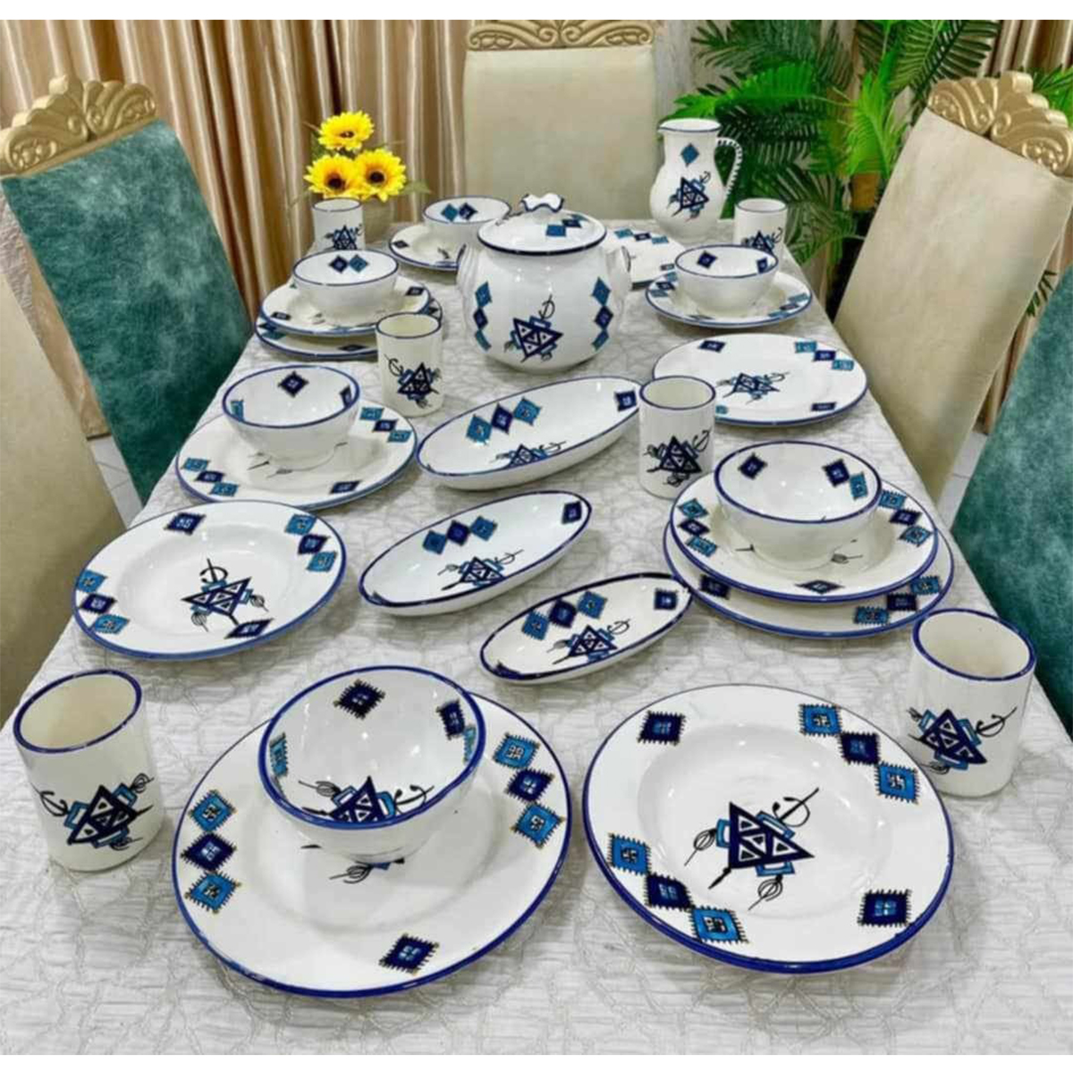Service a table Tradition Khlel bleu 35 pièces en fine céramique émaillée fait main création peinte à la main