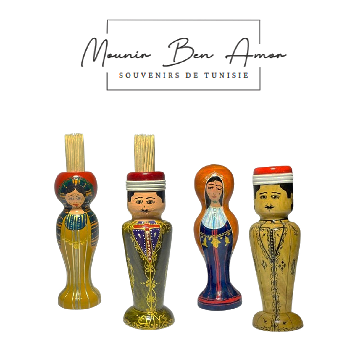 Découvrez les pièces uniques issues de notre collection Souvenir de Tunisie Souvenir de Tunisie. Ces pièces prestigieuses sont des œuvres réalisées dans notre atelier. Notre offre se compose de  1 Porte cure dent de décorative peint à la main sur bois d’olivier Sélection de Figurine Femme en costume traditionnel tunisien