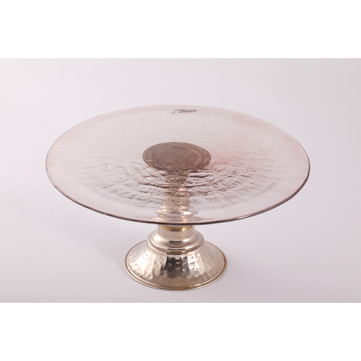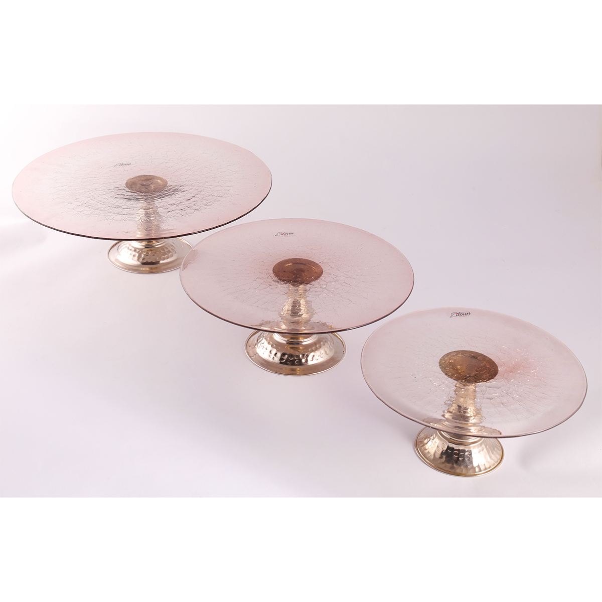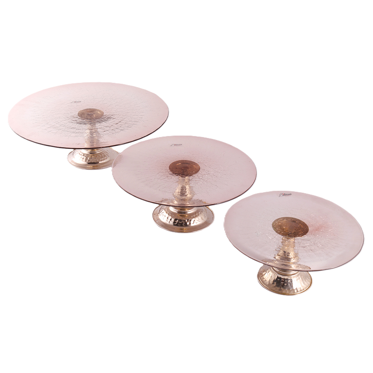 Set de 3 Assiettes Présentoirs à gâteaux et délices haut de gamme pour sublimer vos moments gourmands, majestueuse en verre soufflé bouche craquelé ciselée à la main, qui assume définitivement ses contrastes avec cet inventif pieton en cuivre martelé. Grâce à sa grande capacité, cette assiette présentoir garantit le plaisir à chaque utilisation.