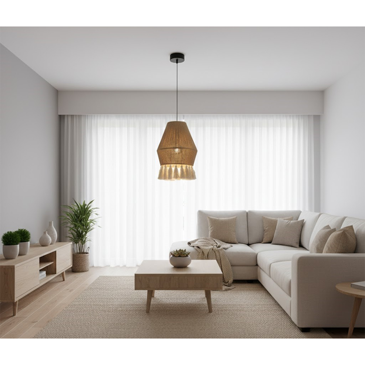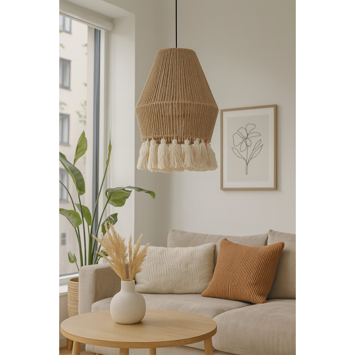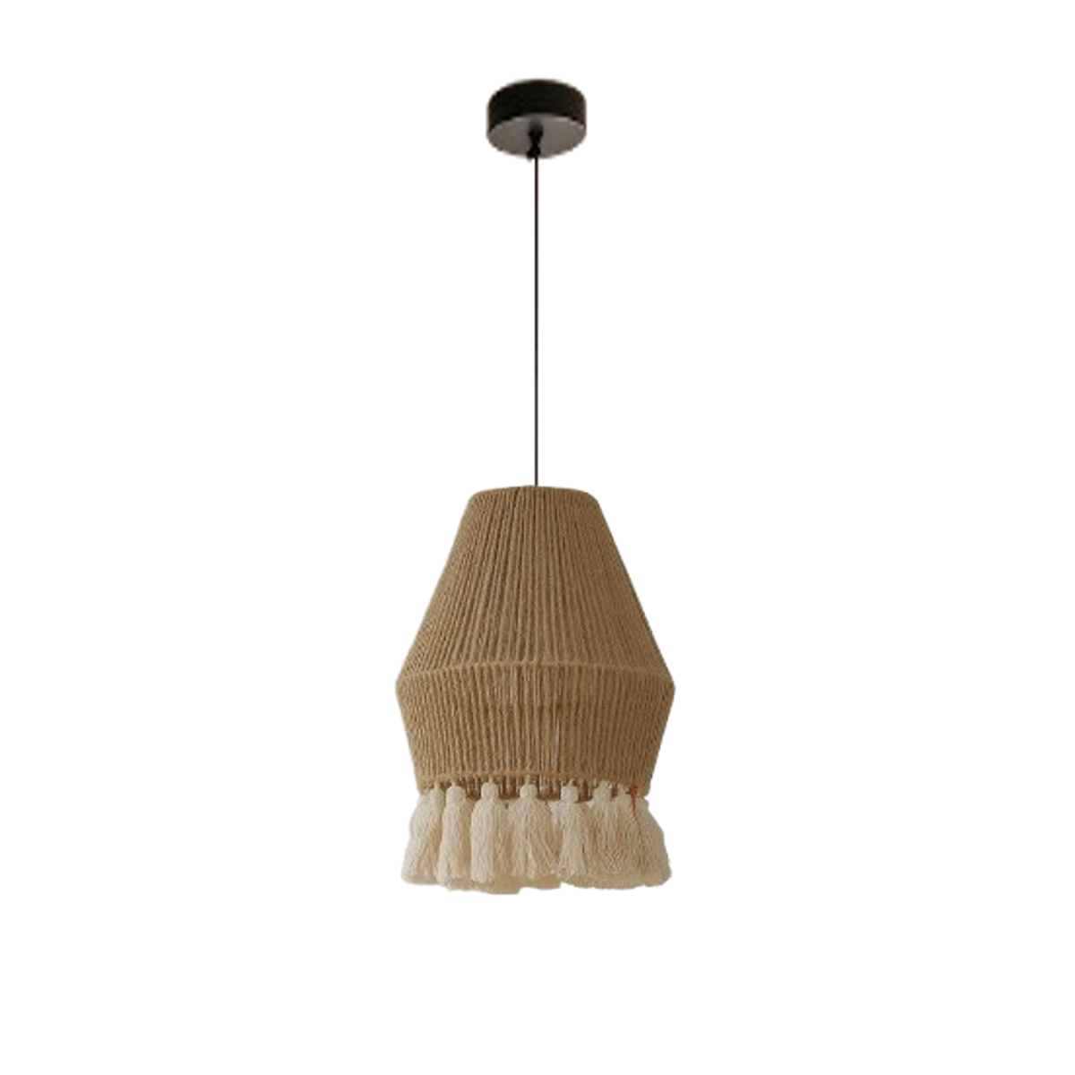 Majestueuse suspension lumineuse en corde tressé à la main et pompons en macramé , design vintage. Polyvalente, idéale pour tous les styles de décoration, parfaite pour apporter une touche organique à votre décoration intérieure. Parfaite pour illuminer chaleureusement un espace repas, salle à manger, un coin lecture ou un intérieur minimaliste.