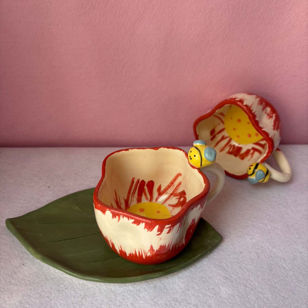 Tasse à café avec sous tasse esprit vintage motif : Fleur et nahoula, en céramique artisanale fait main