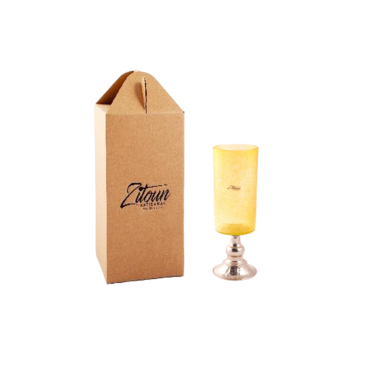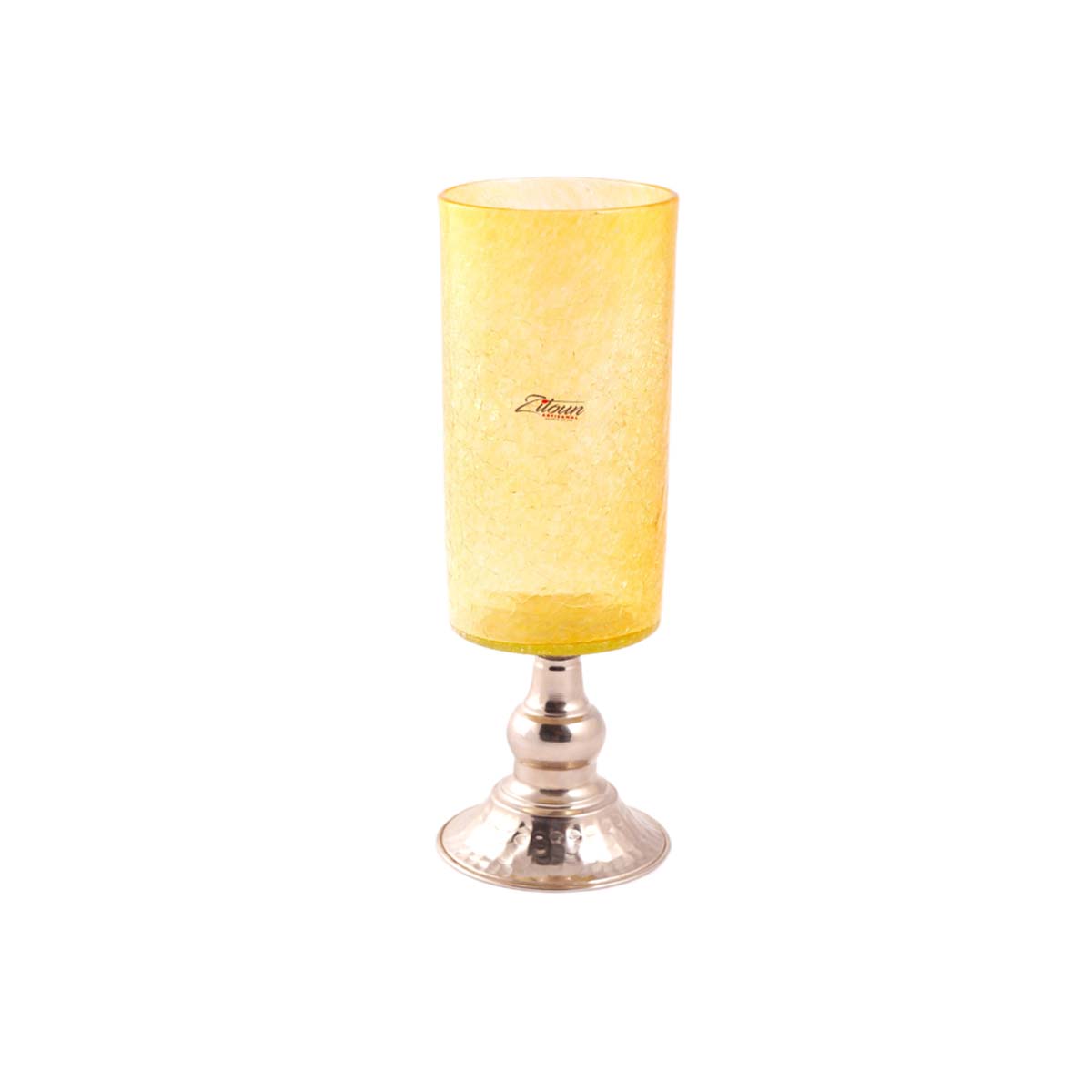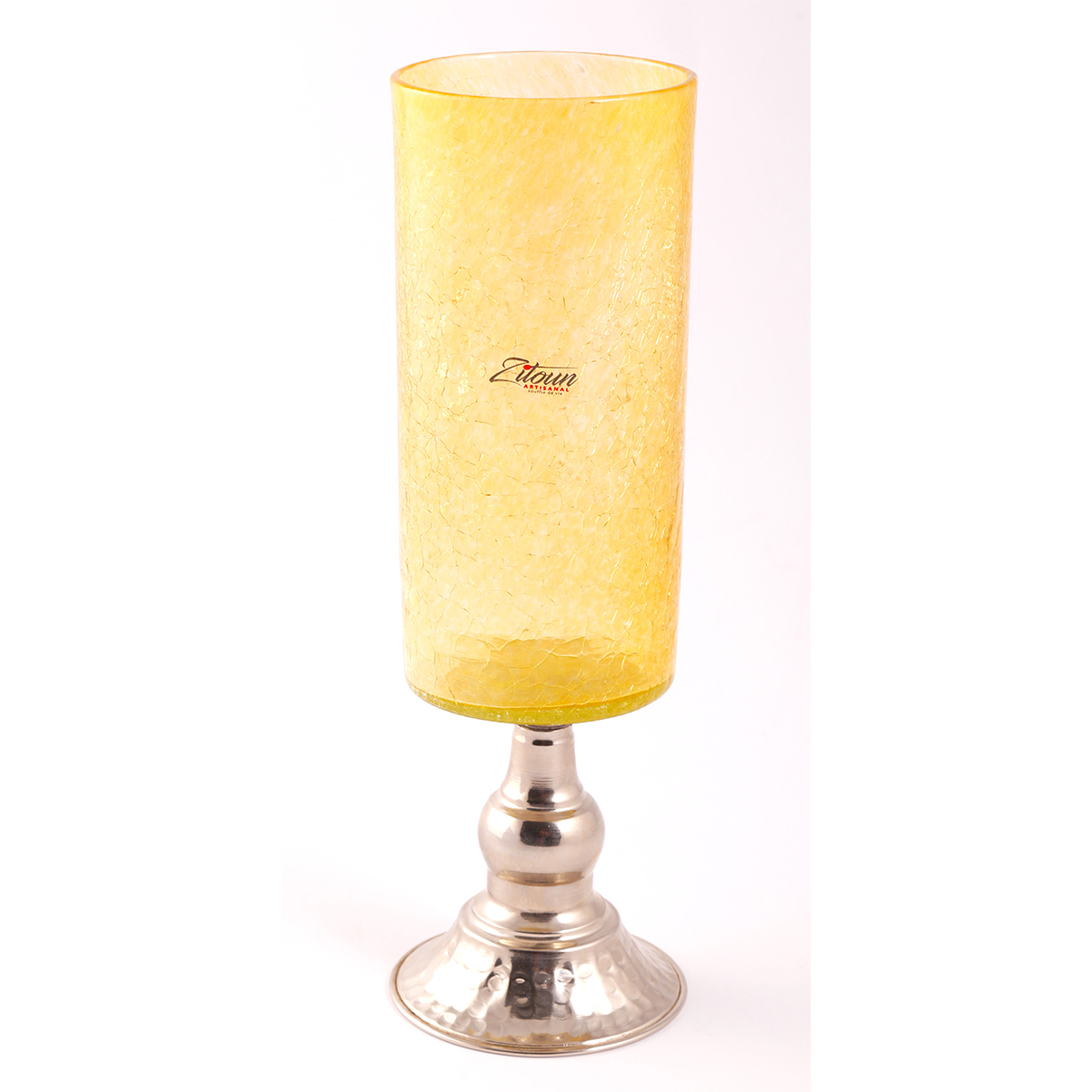 Découvrez ce vase artistique et lanterne haut de gamme majestueuse en verre soufflé bouche craquelé ciselée à la main, en jaune qui assume définitivement ses contrastes avec cet inventif piètement en cuivre martelé