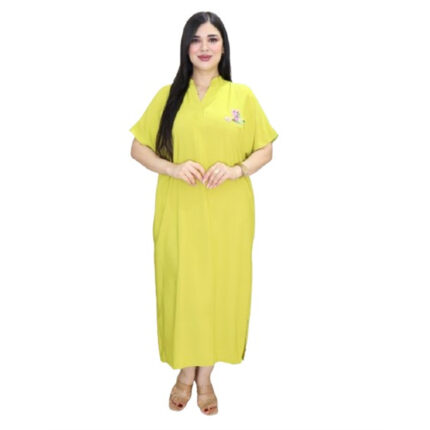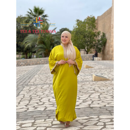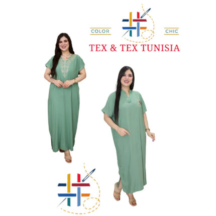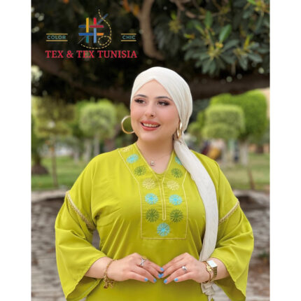 Jebba fashion printemps-été 2025 – Jebba « Chams » en Crêpe haut de gamme en broderie motif chams sur la poitrine, en vert anis